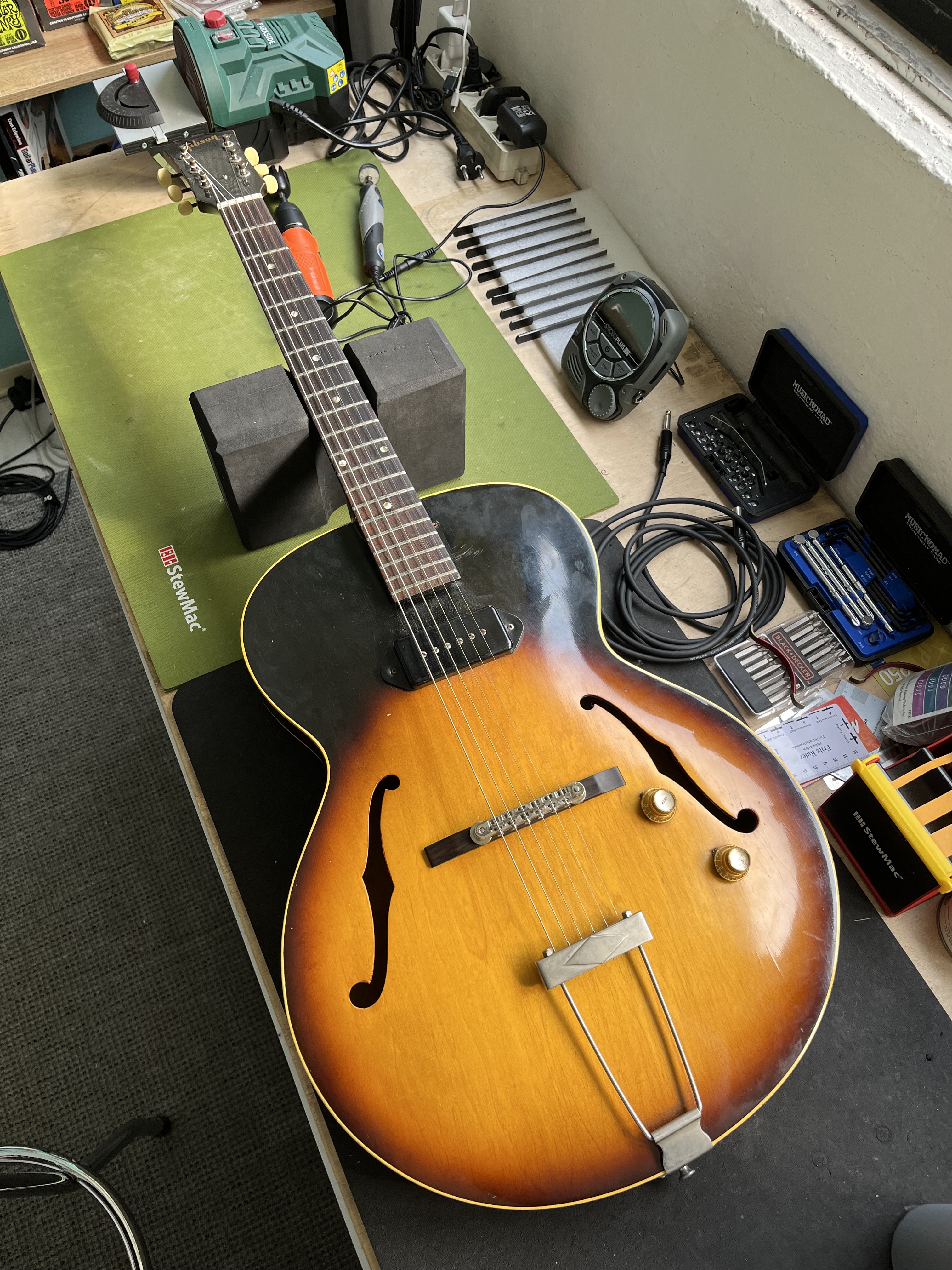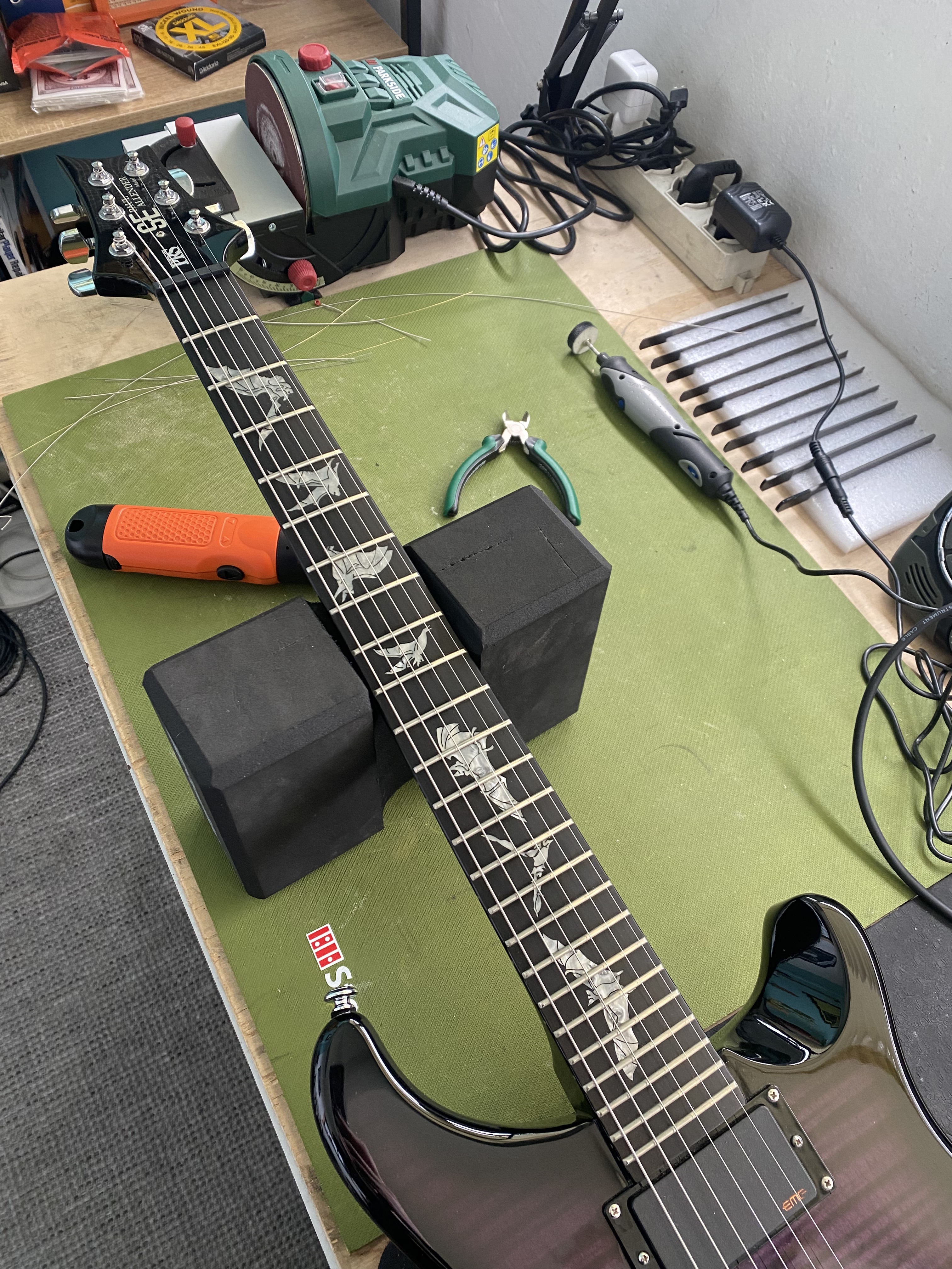Eseguo set up, cambi corde, modifiche elettroniche e strutturali, refret e rettifiche tasti, piccole riparazioni estetiche, capotasti e ponticelli in osso, installazione ponti Evertune®